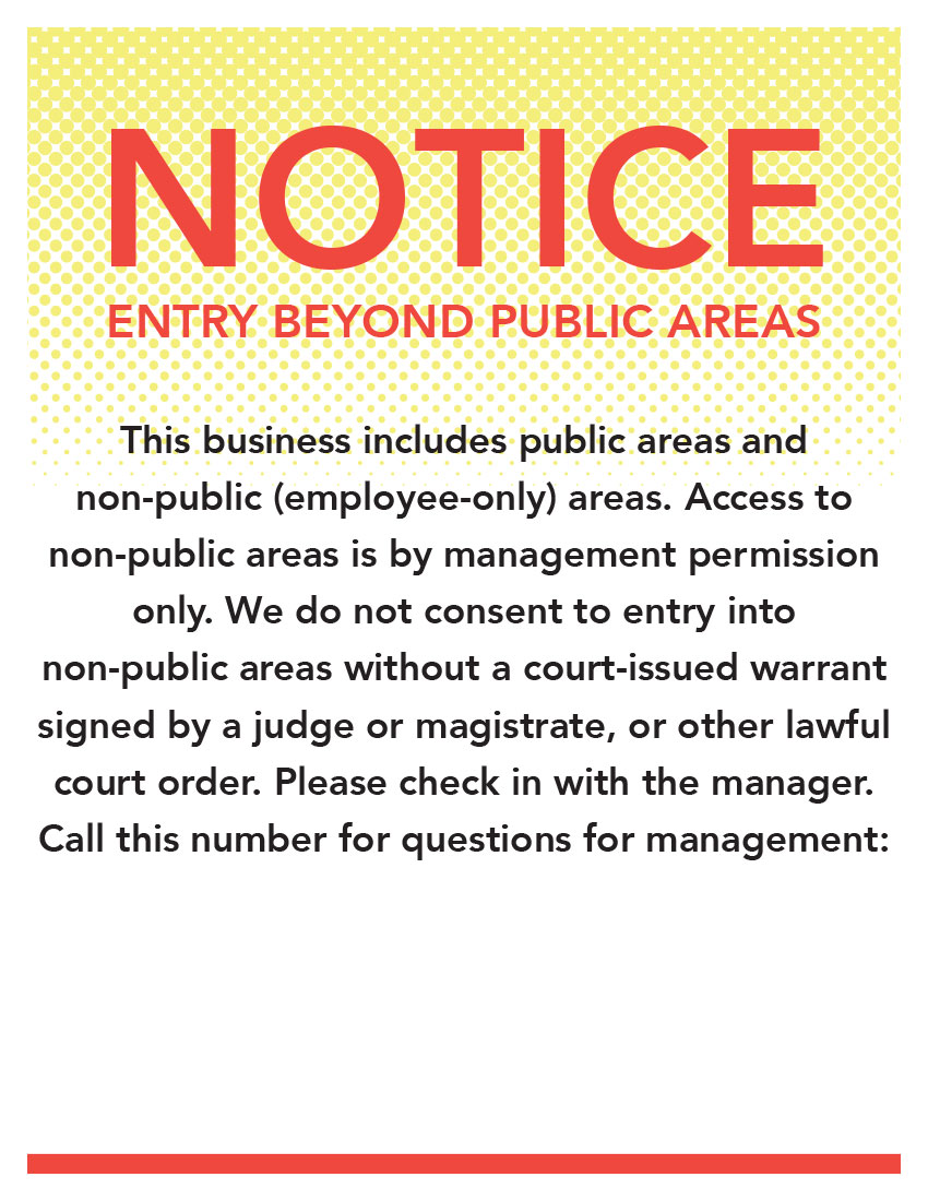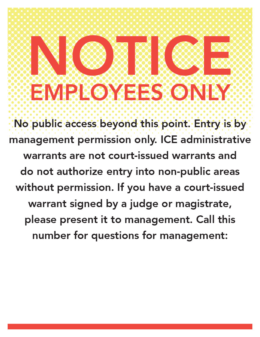 Many workplaces include areas open to the public (such as a retail floor, lobby, or waiting area) as well as non‑public areas (such as behind‑the‑counter space, employee break rooms, storage areas, and back offices). In general, ICE may enter public areas without the business’s permission. Entry into non‑public areas generally requires the business’s permission, a subpoena, or a court‑issued warrant signed by a judge. Businesses can reduce confusion by clearly marking employee‑only areas and keeping those areas closed to public access.