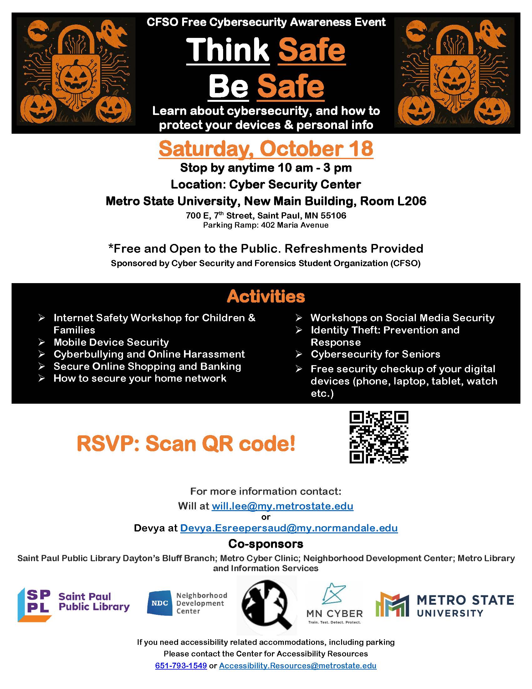 Whether you're a parent concerned about your child’s online safety, a small business owner managing sensitive data, or simply someone who wants to better understand digital threats, Think Safe Be Safe will offer valuable insights and resources. All attendees are invited to bring their personal computing devices—laptops, tablets, phones—to get checked by cybersecurity professionals! Hosted at the university’s state-of-the-art Cyber Security Center, the event will feature interactive workshops, expert-led sessions, and practical demonstrations designed to help attendees understand how to protect their personal data and privacy. RSVP by scanning the QR code.