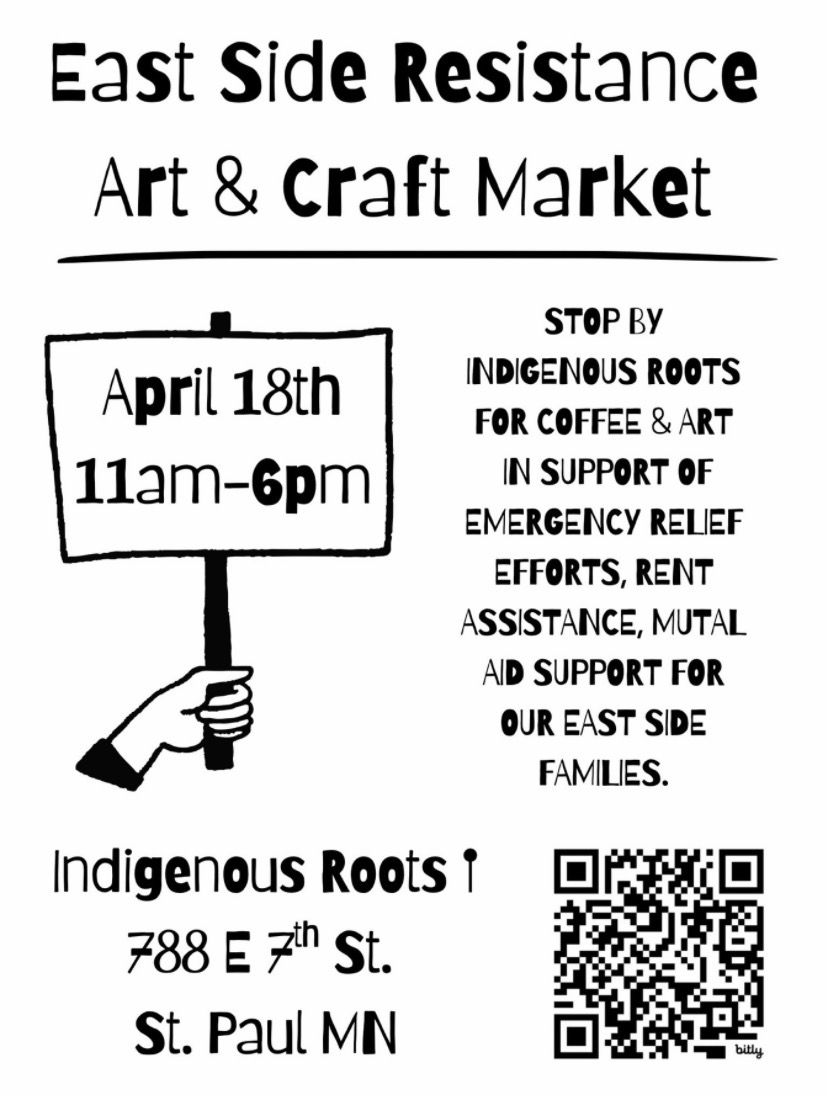 Stop by Indigenous Roots for coffee & art in support of emergency relief efforts, rent, mutual aid support for east side families.